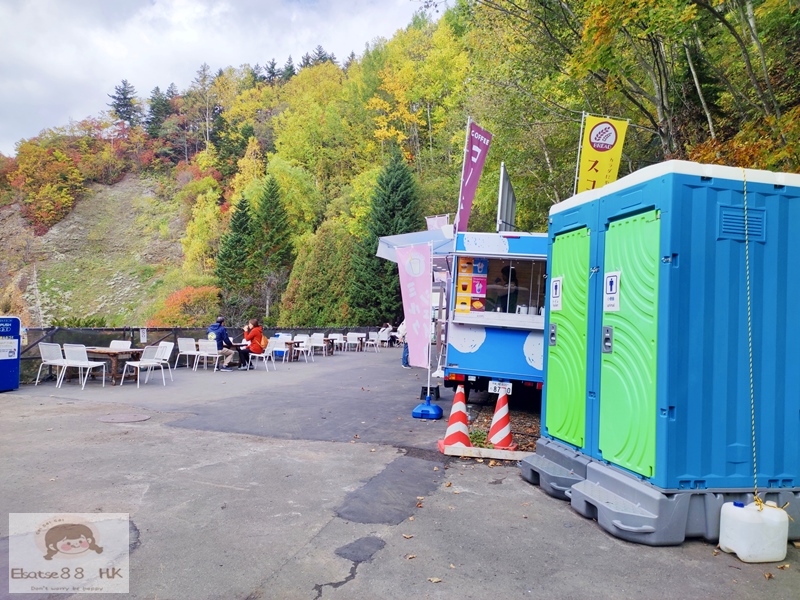 10月剛好是「豐平峽」的紅葉季節,這個在附近的休息站(距離「豐平峽」還有21公里),已經擠滿了車😱